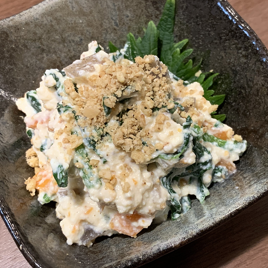 ●今日のたいたん (日替わり煮物) ●今日のねり天 ●焼きしいたけ ●焼きししとう ●ほうれん草のおひたし ●ねぎぬた ●白あえ